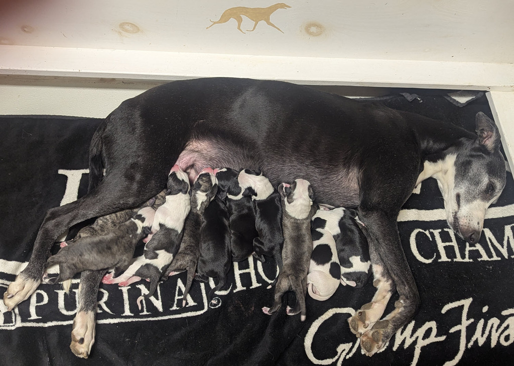 Nero was bred to Walker on December 26, 2024, with 10 wild whippet puppies born on February 27, 2025!