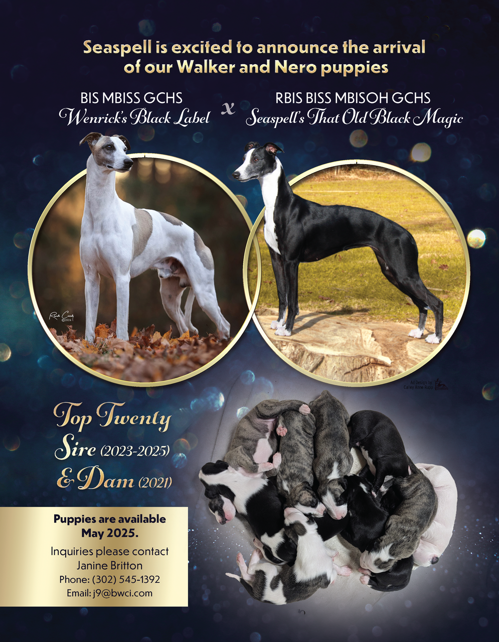 Seaspell is excited to announce the arrival of our Nero (RBIS BISS MBISOH GCHS Seaspell’s That Old Black Magic) and Walker (BIS MBISS GCHS Wenrick’s Black Label) puppies! Both sire and dam are/were top 10 whippets. Puppies are available May 2025.