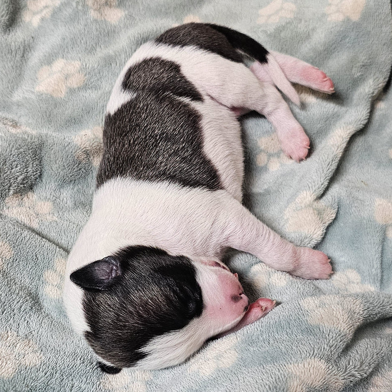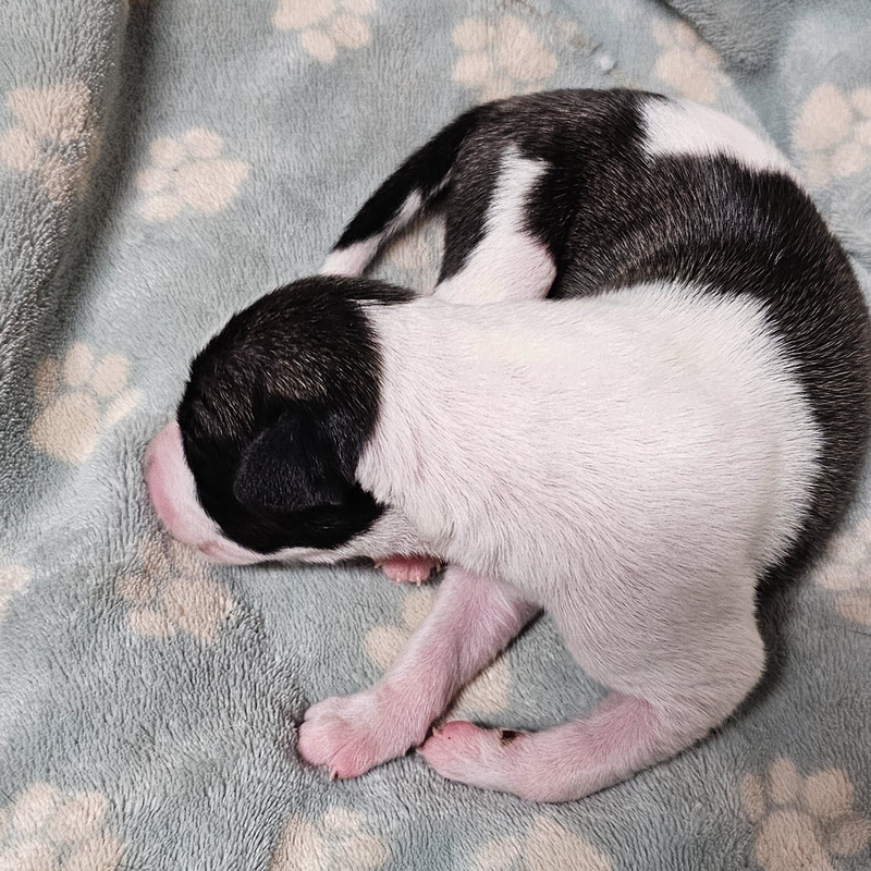 • Eighth puppy born 5:10 am - Little boy, mouth good, Weight = 10.8 oz - black boy white face
