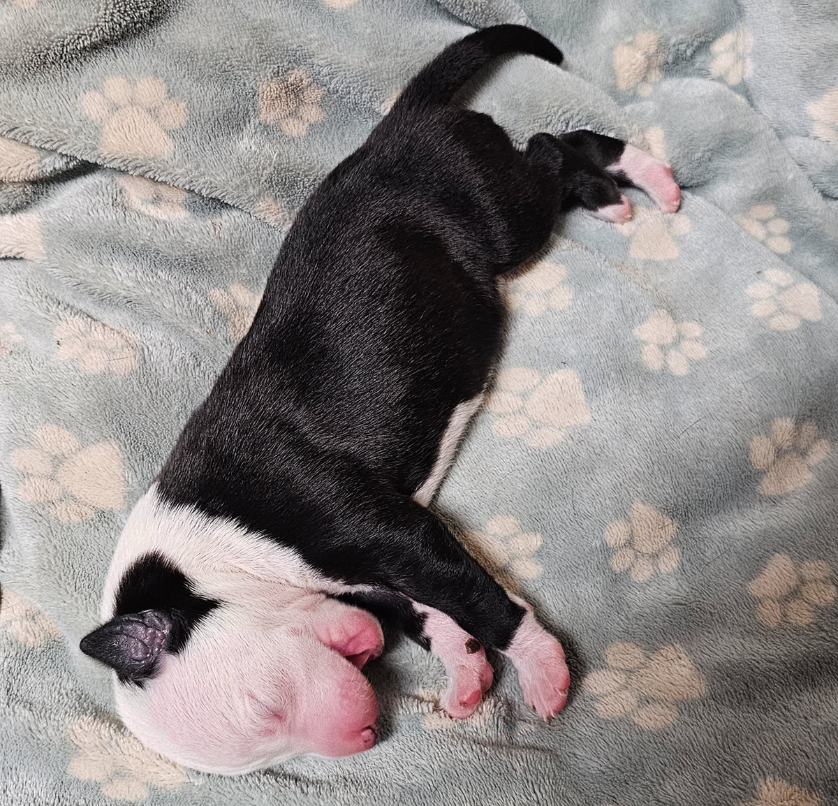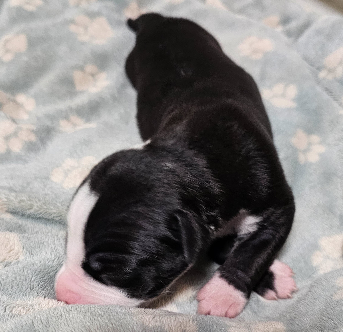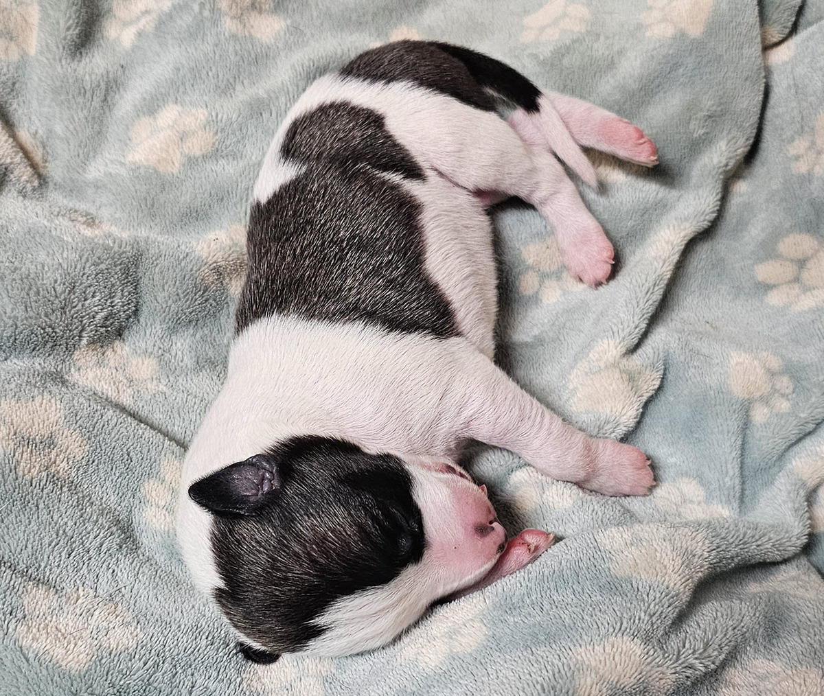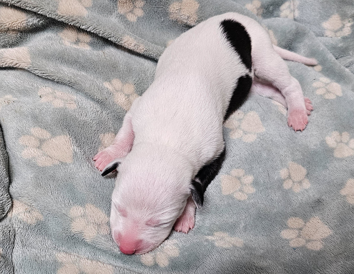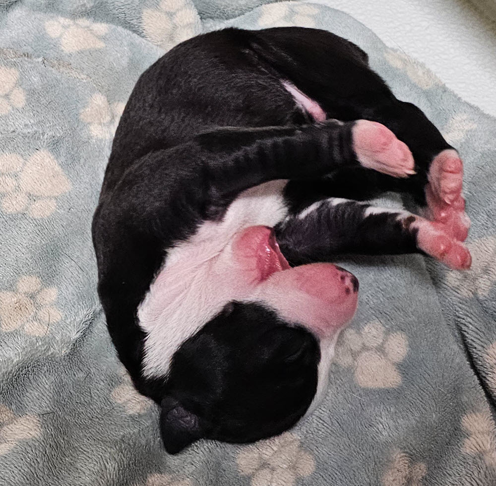 • Eighth puppy born 5:10 am - Little boy, mouth good, Weight = 10.8 oz - black boy white face