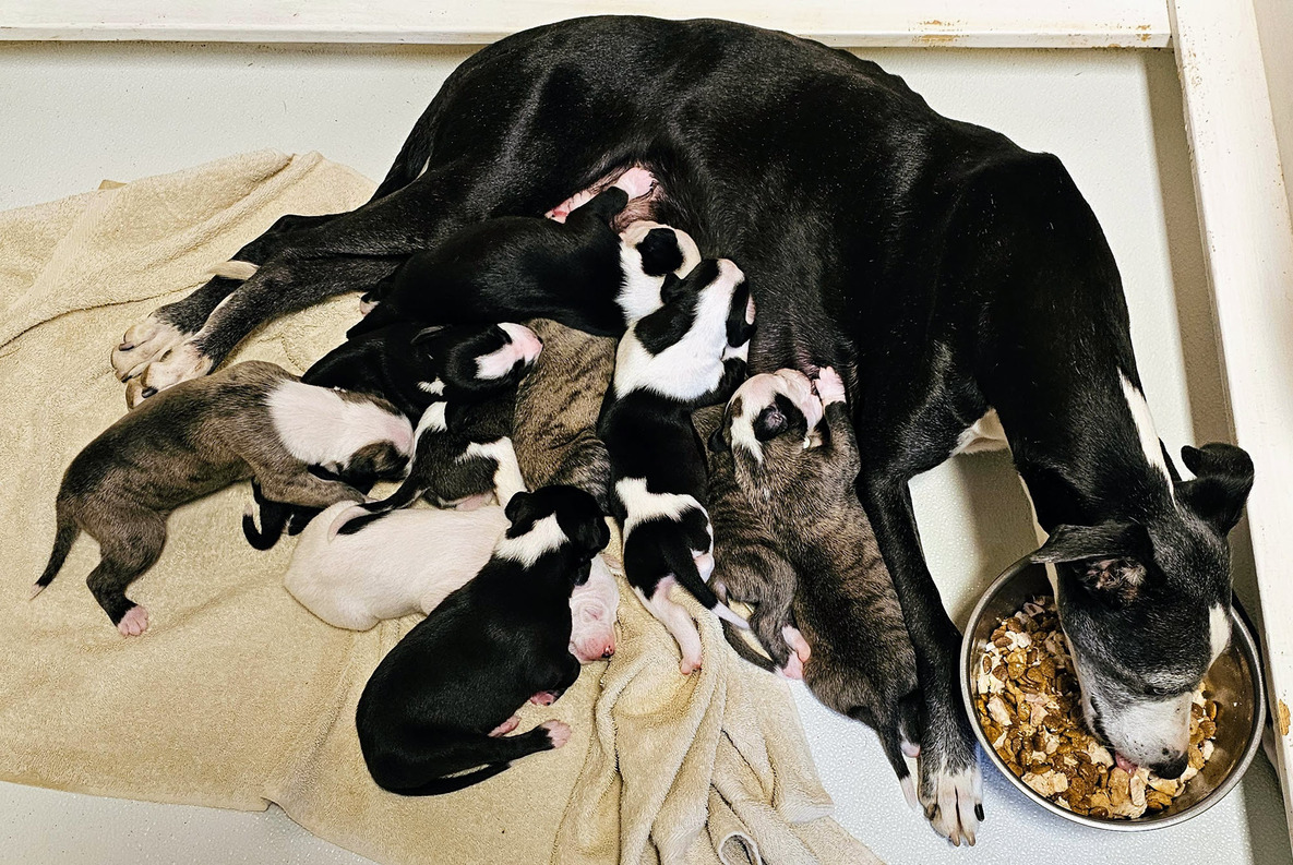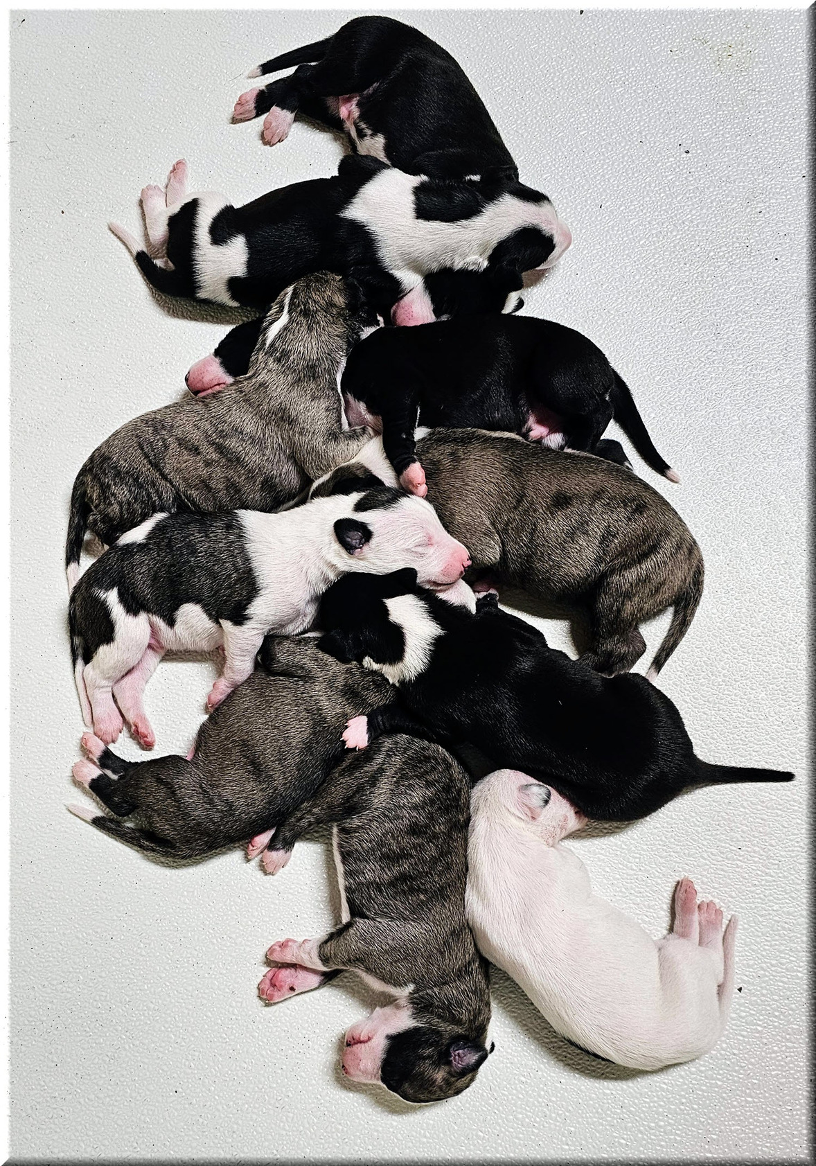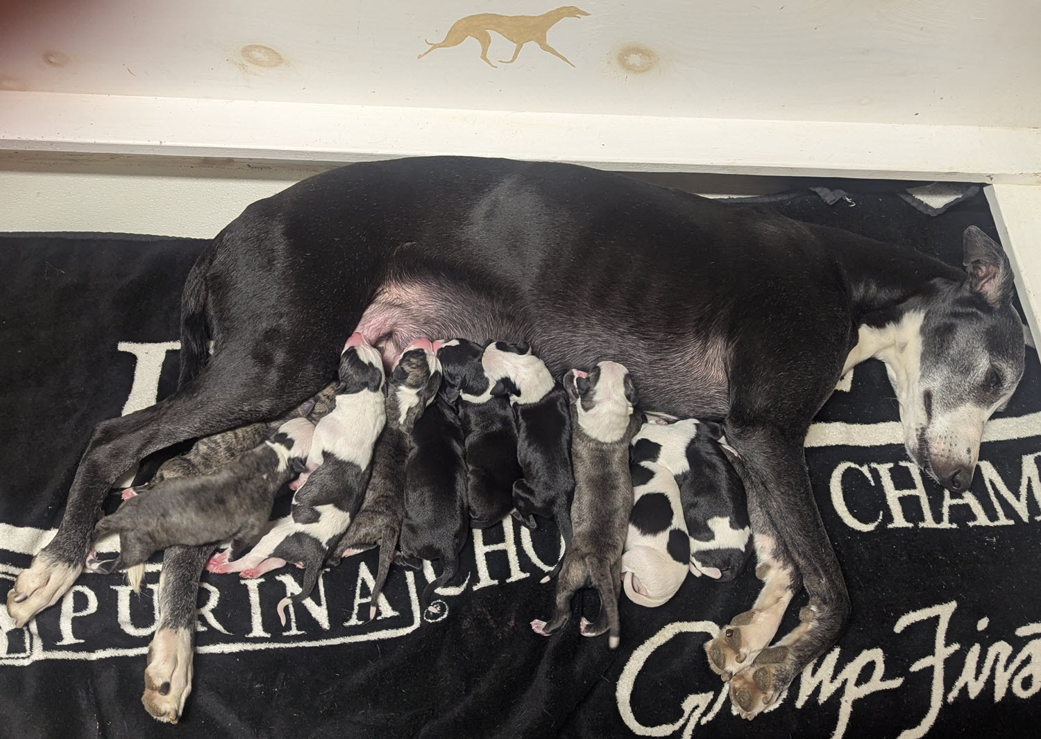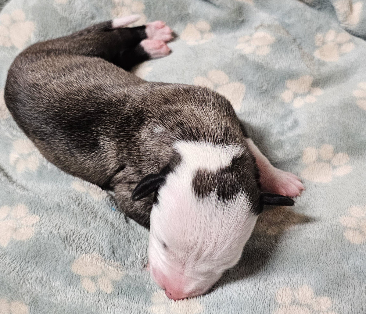 • Tenth puppy born 4:21 pm - Little girl, mouth good, Weight = 14.5 oz - Blue brindle girl