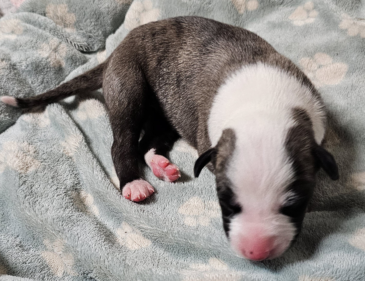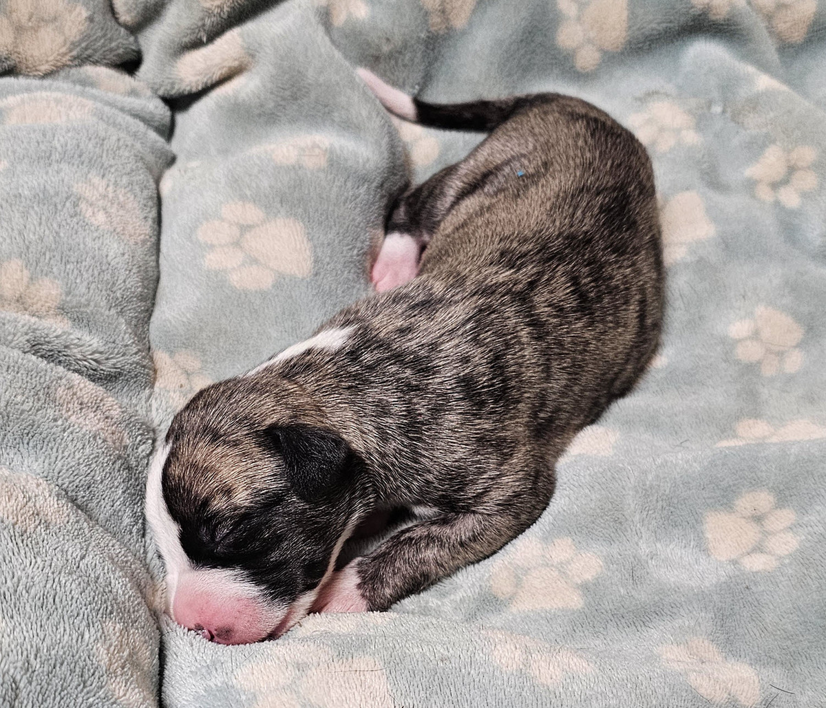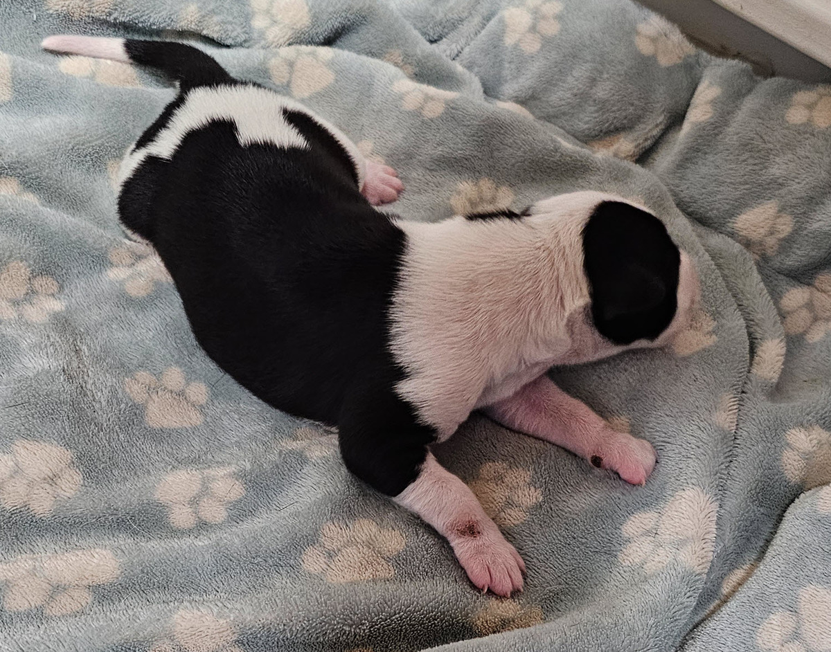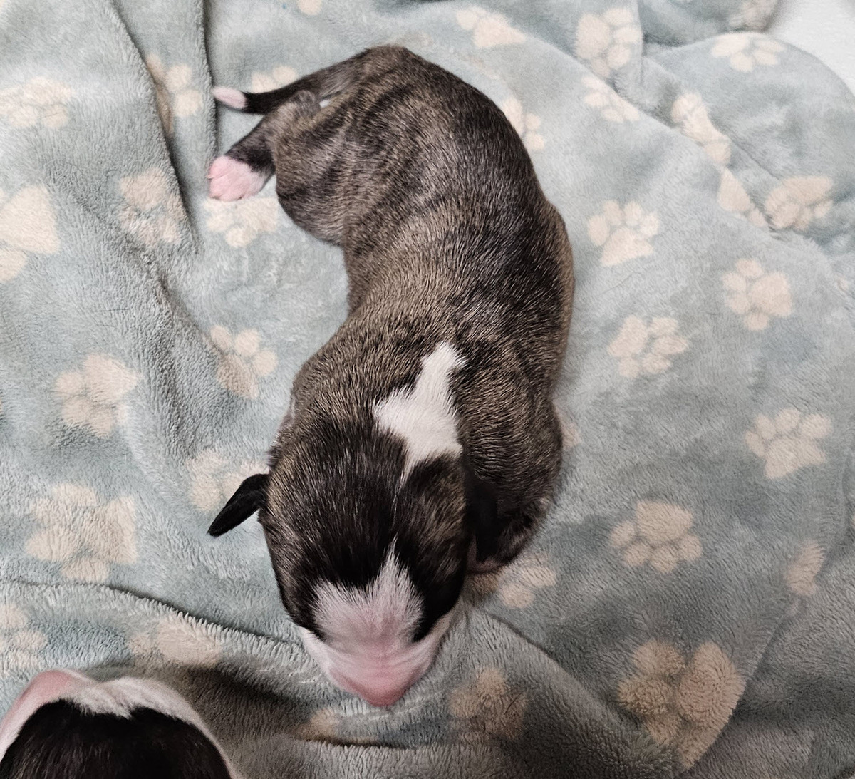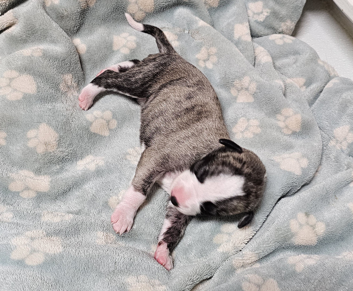 • Third puppy born 2:44 am - Little boy, mouth good, Weight = 11.1 oz - brindle boy white neck