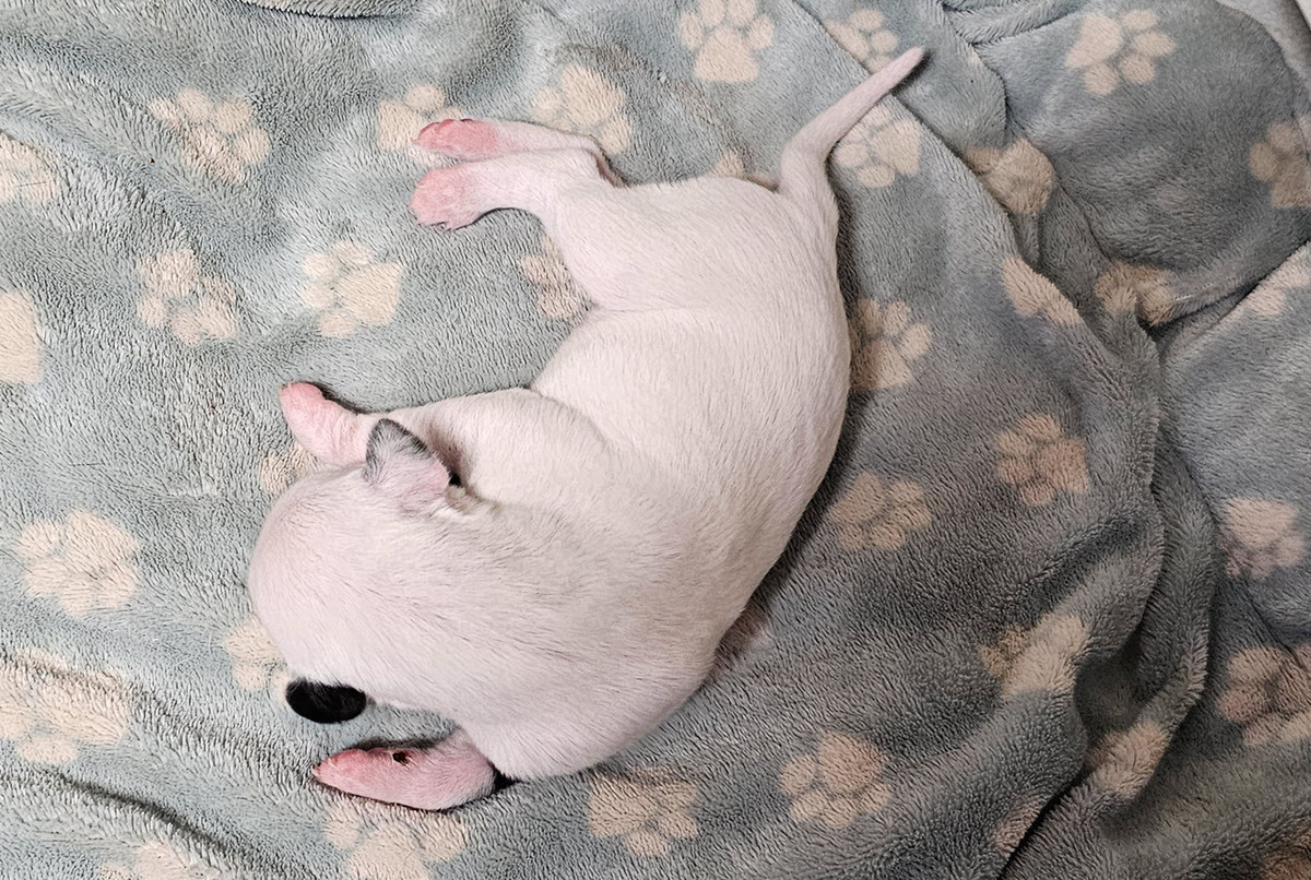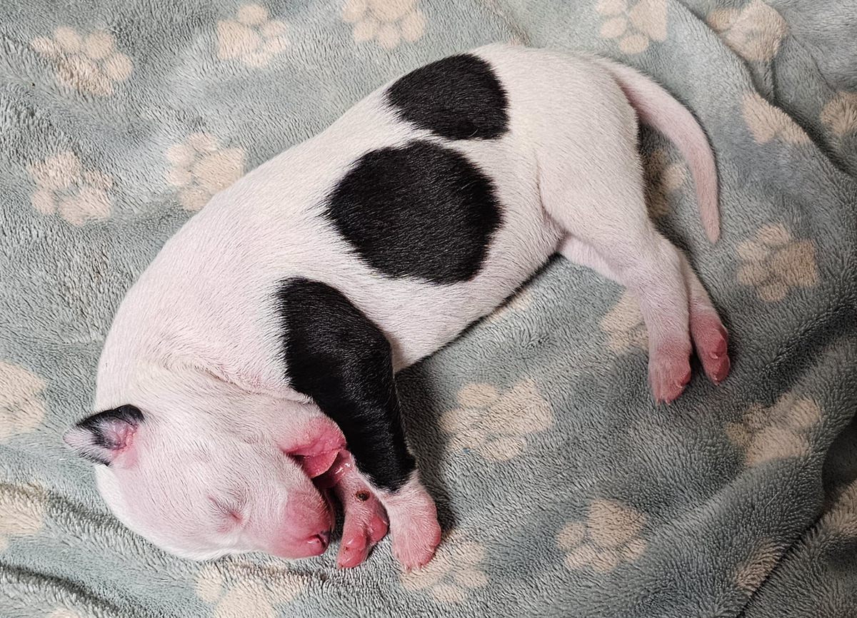 • Seventh puppy born 4:51 am - Little girl, mouth good, Weight = 10.8 oz - white girl with black spots