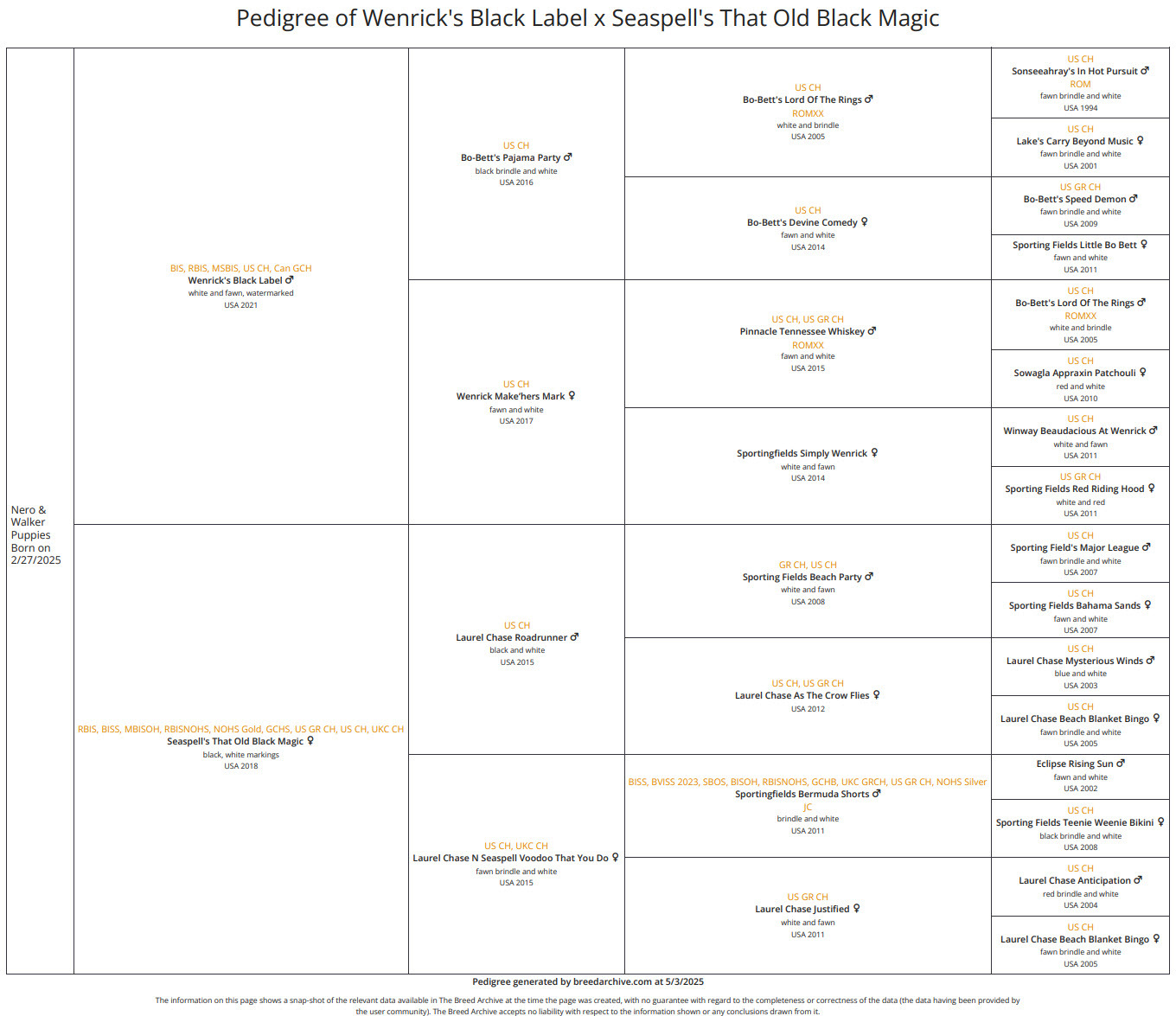 Seaspell is excited to announce the arrival of our Nero (RBIS BISS MBISOH GCHS Seaspell’s That Old Black Magic) and Walker (BIS MBISS GCHS Wenrick’s Black Label) puppies! Both sire and dam are/were Top 10 whippets. Puppies are available May 2025. Inquiries please contact Janine Britton at 302 545-1392 (j9@bwci.com).