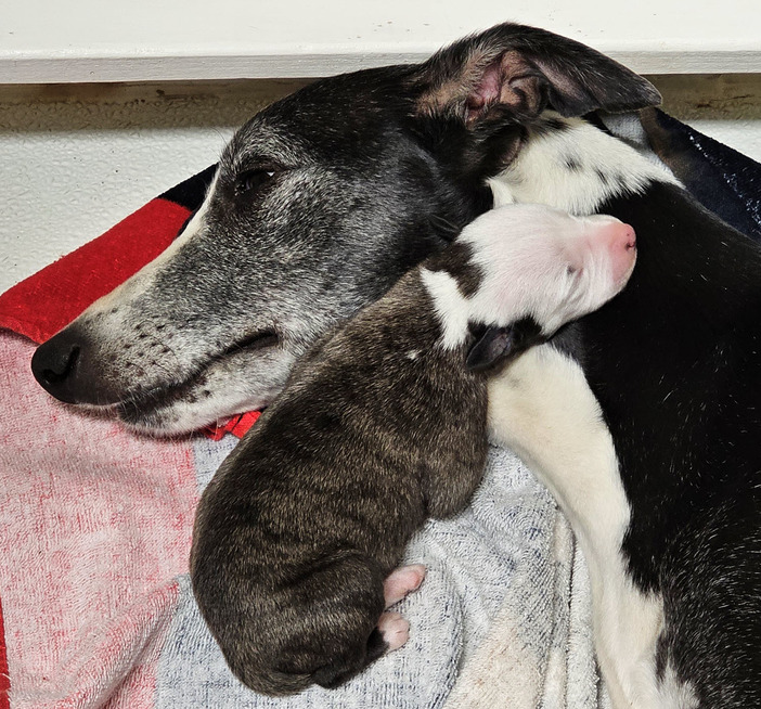• Second puppy born 2:38 am - Little boy, mouth good, Weight = 10.8 oz - brindle boy white face
